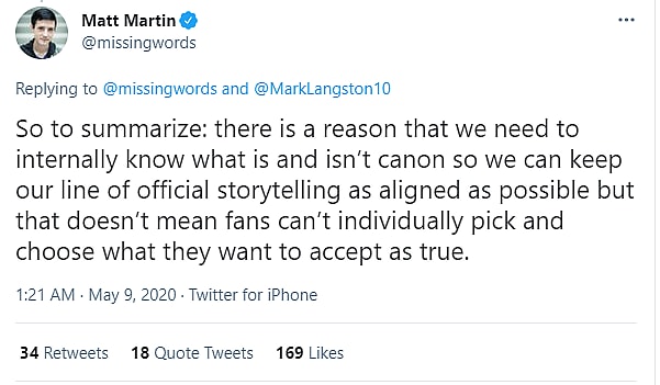 Back in May 2020, he tweeted, “So to summarize: there is a reason that we need to internally know what is and isn’t canon so we can keep our line of official storytelling as aligned as possible but that doesn’t mean fans can’t individually pick and choose what they want to accept as true.”