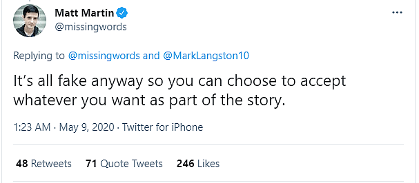 He added, “It’s all fake anyway so you can choose to accept whatever you want as part of the story.”