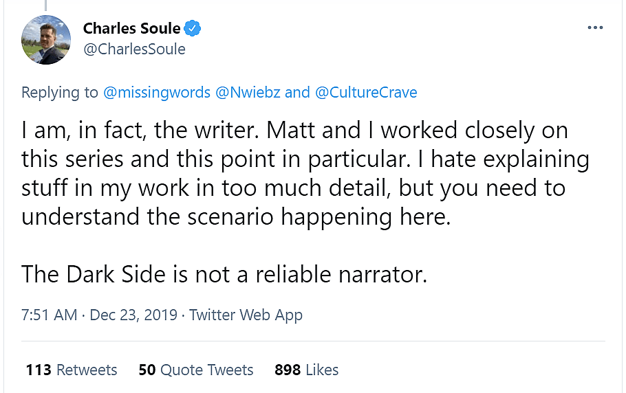 Charles Soule, who penned the script for Darth Vader #25, also stated, “I am, in fact, the writer. Matt and I worked closely on this series and this point in particular. I hate explaining stuff in my work in too much detail, but you need to understand the scenario happening here. The Dark Side is not a reliable narrator.”