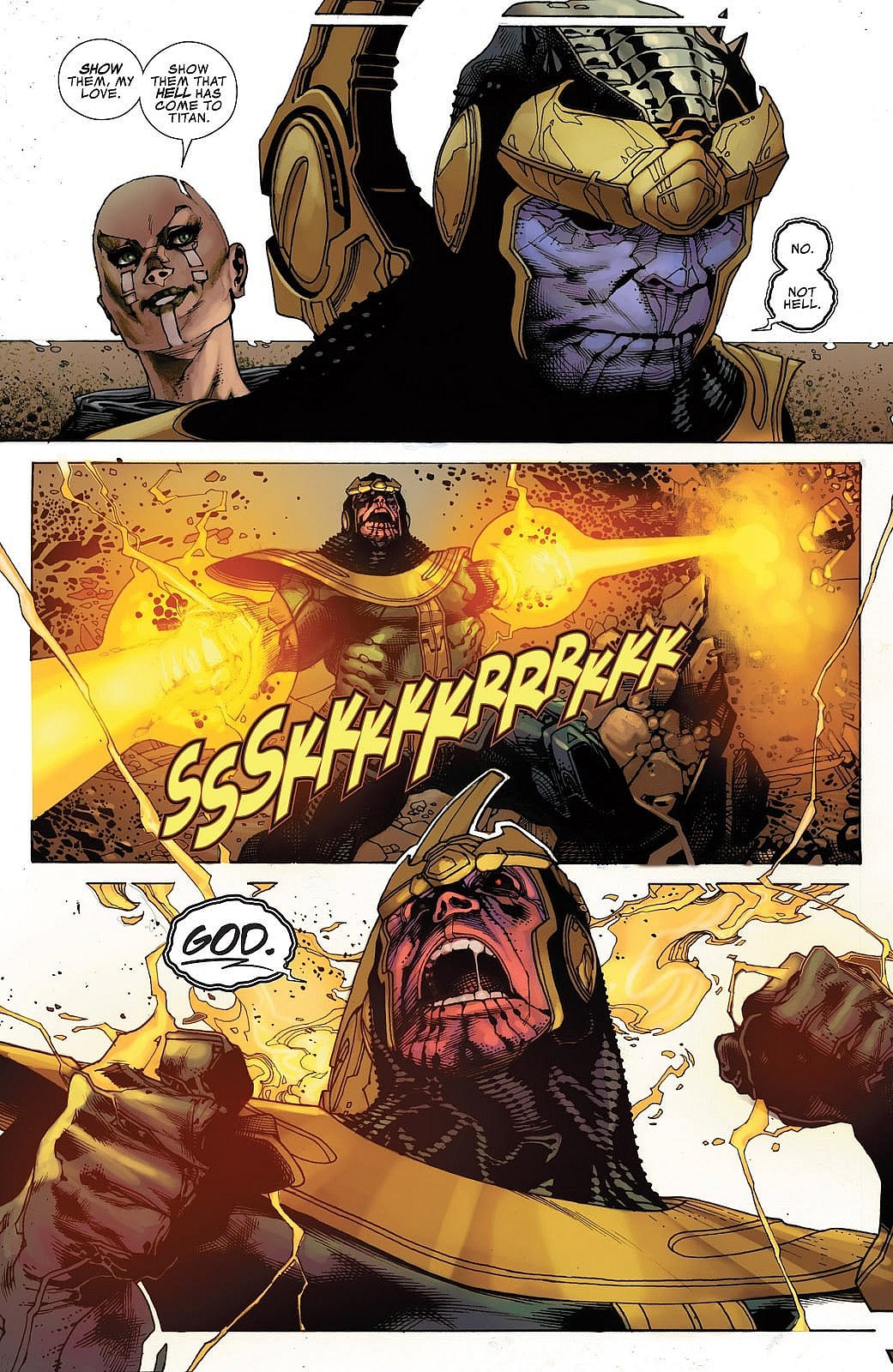 Thanos brings murder to his home planet of Titan. He experiments on his classmates and even kills his mother in order to win the affection of Death. He eventually leaves the planet and begins exploring the galaxy with a band of space pirates and sowing his seed across the galaxy. But he eventually returns in order to pursue Death. She tells him to kill off all of his offspring in order to warrant her affection. Thanos willingly carries out her wishes, but eventually confronts her and gets her to reveal that she is Death. This enrages Thanos and sees him return to Titan, where he launches an orbital strike that decimates the planet.
