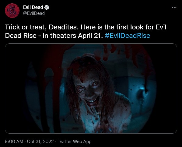 “Trick or treat, Deadites,” wrote the account. “Here is the first look for Evil Dead Rise – in theaters April 21.”