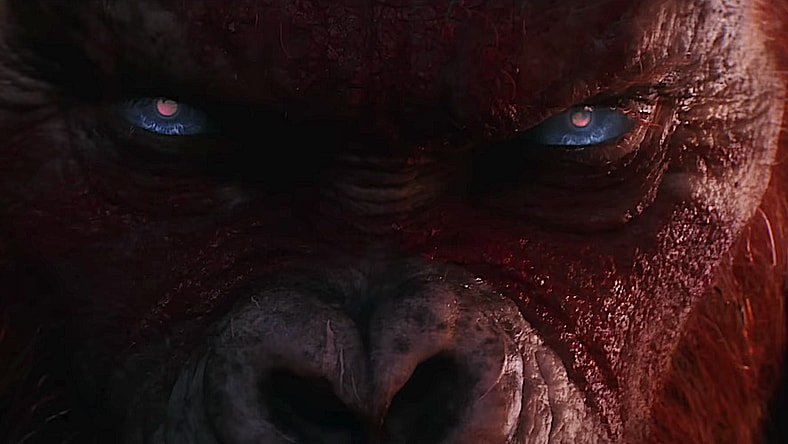 Watched it in full? Then you probably saw the tail end that lingers on an extreme close-up of the beast, which is clearly an ape-like Titan with similar features to Kong. However, this one has glowing blue eyes, and reddish fur, and wears what some observers determine to be war paint. If true, these details raise serious questions.