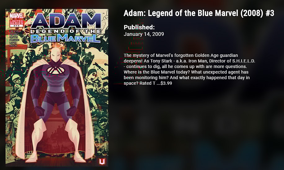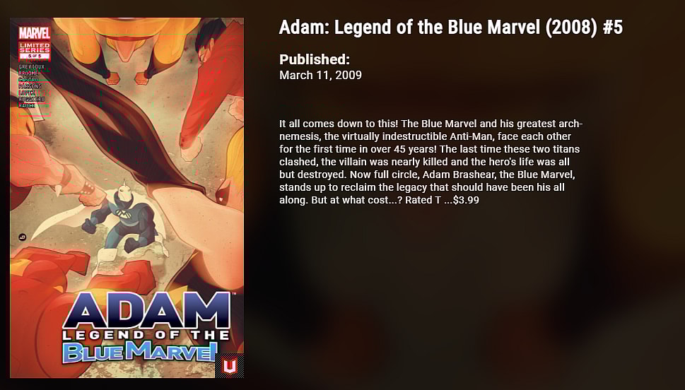 Blue Marvel is a relatively new character. He first appeared in Adam: Legend of the Blue Marvel #1 by Kevin Grevioux and Mat Broome in 2008.