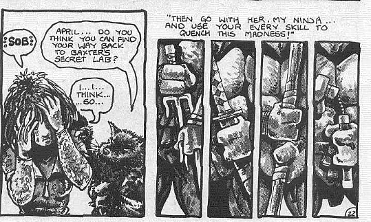 All of the turtles then recite an anti-human screed taught to them by Master Splinter, “Humans are the demon scum of the Earth. Avoid them. Don’t say hi. They lust to murder that which is different from them. To interact with them is to die.”
