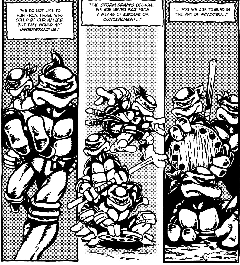 The book even depicts NYPD officers who arrive after the Turtles have beaten up a number of members of the Purple Dragon as “allies.” Leonardo says, “We don’t like to run from those who could be our allies, but they would not understand us.”