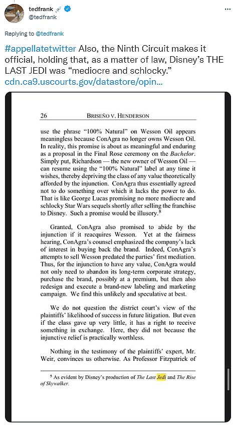 He wrote on Twitter, “Also, the Ninth Circuit makes it official, holding that, as a matter of law, Disney’s THE LAST JEDI was ‘mediocre and schlocky.'”