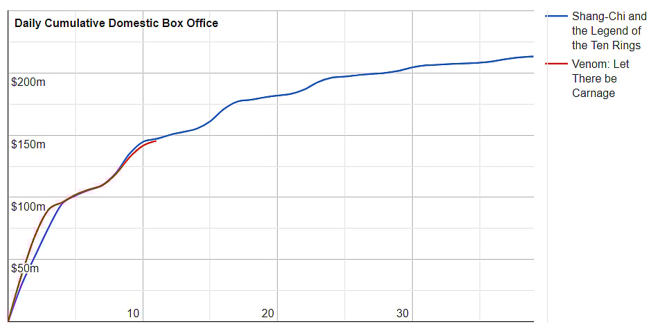 The film is still on pace with Shang-Chi and the Legend of the Ten Rings despite that film having over a month without any competition at the box office.