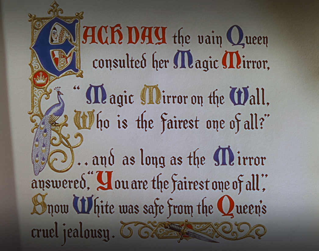 If you recall from the 1937 Disney film, it opens with a page from a fairytale book that reads, “Each day the vain Queen consulted her Magic Mirror, ‘Magic Mirror on the Wall, Who is the fairest one of all?’ .. and as long as the Mirror answered, ”You’re the fairest one of all, Snow White was safe from the Queen’s cruel jealousy.”