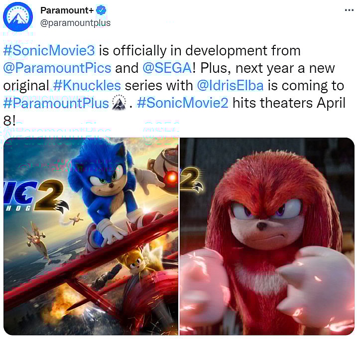 “#SonicMovie3 is officially in development from @ParamountPics and @SEGA!” Paramount stated in a hash-tag laden tweet. “Plus, next year a new original #Knuckles series with @IdrisElba is coming to #ParamountPlus. #SonicMovie2 hits theaters April 8!”