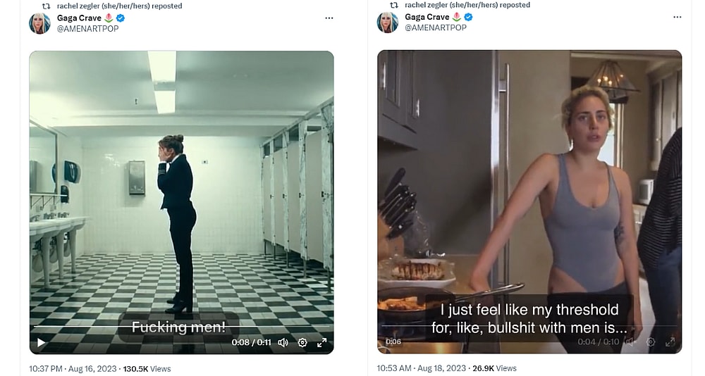 In the second, Lady Gaga states, “I just feel like my threshold for, like, bullshit with men is- it’s just- I don’t have one anymore.”