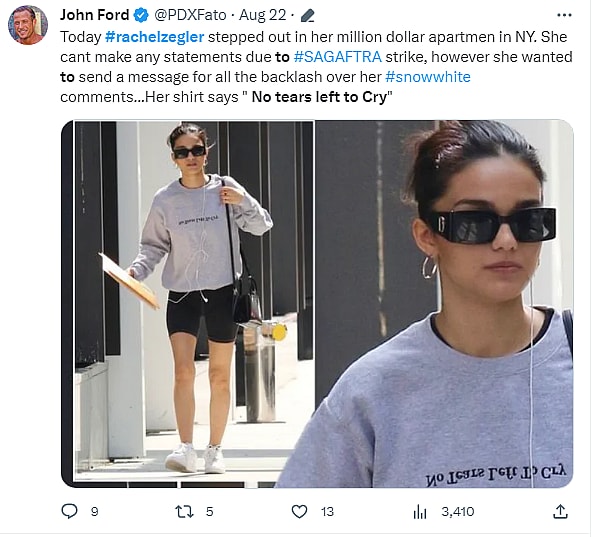 X user John Ford shared the images to the social media platform, where he speculated, “She cant make any statements due to #SAGAFTRA strike, however she wanted to send a message for all the backlash over her #snowwhite comments….Her shirt says ‘No tears left to Cry.'”