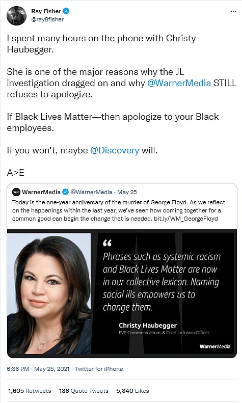 Ray Fisher Accuses WarnerMedia “Chief Inclusion Officer” of Delaying Justice League Investigation, Wants Apology for Black Employees