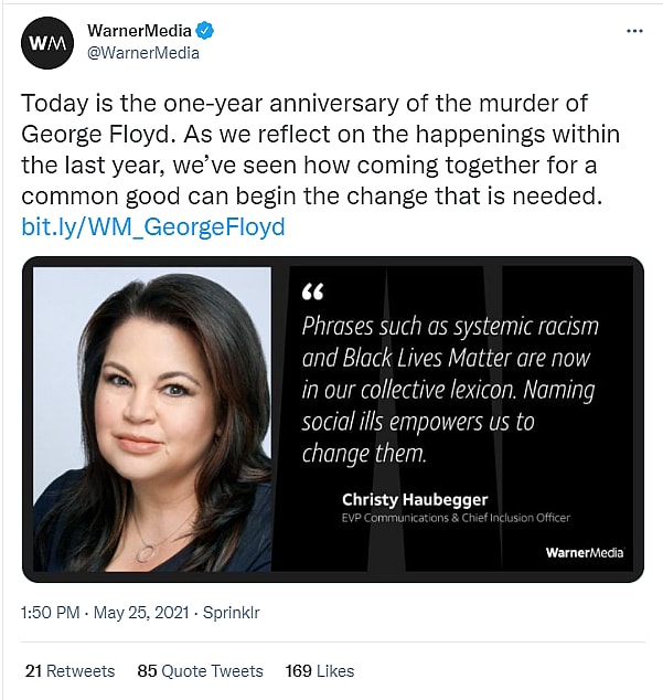 In the tweet from their official account acknowledging the anniversary of the death of George Floyd, Warner wrote, “Today is the one-year anniversary of the murder of George Floyd. As we reflect on the happenings within the last year, we’ve seen how coming together for a common good can begin the change that is needed.”