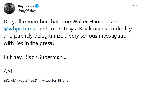 He later accused Hamada via Twitter of destroying his credibility before taking a shot at Warner’s announcement of a Black Superman. Fisher considers it a deflection by the studio to take heat off him and the Justice League debacle.