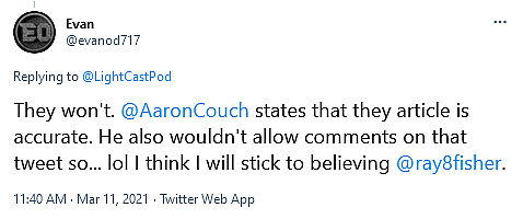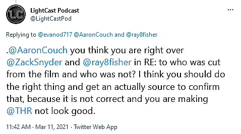 “.@AaronCouch you think you are right over @ZackSnyder and @ray8fisherin RE: to who was cut from the film and who was not?” LightCast tweeted to Couch. “I think you should do the right thing and get an actually source to confirm that, because it is not correct and you are making @THR not look good.”