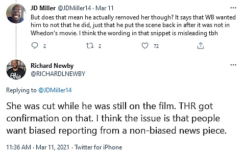 Sharing Snyder’s own words from his Vanity Fair profile, wherein the director revealed WB and former head Kevin Tsujihara told him to take Kiersey Clemons and her subplot out of the film to tighten the running time. Newby tweeted that the information in Couch was correct, claimed fans were just trying to harass reporters, and claimed that “there’s no hidden agenda here.”