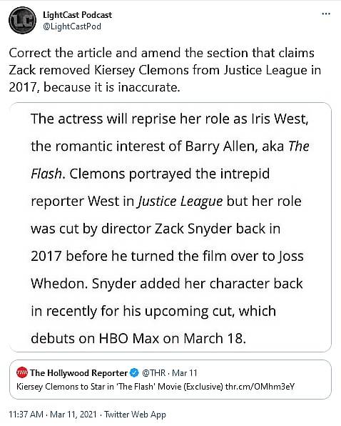 “Correct the article and amend the section that claims Zack removed Kiersey Clemons from Justice League in 2017, because it is inaccurate,” said LightCast’s post.