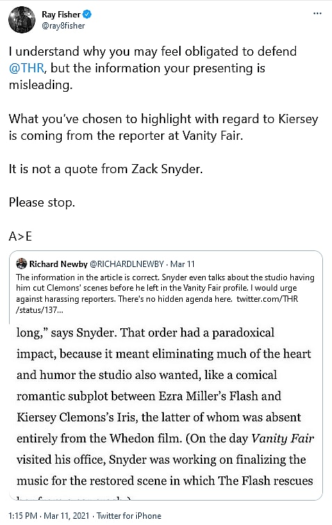 Ray Fisher Calls Out The Hollywood Reporter For Inaccurate Claim Zack Snyder Cut Kiersey Clemons From Justice League