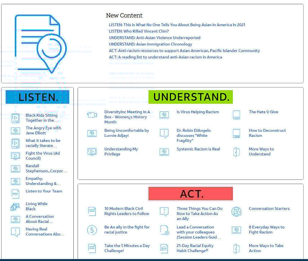 Another resource provided by AT&T in the online portal is a “21-Day Racial Equity Habit Building Challenge,” developed by diversity education, research, and consulting firm America & Moore, which invites employees to “do one action [a day] to further [their] understanding of power, privilege, supremacy, oppression, and equity.”
