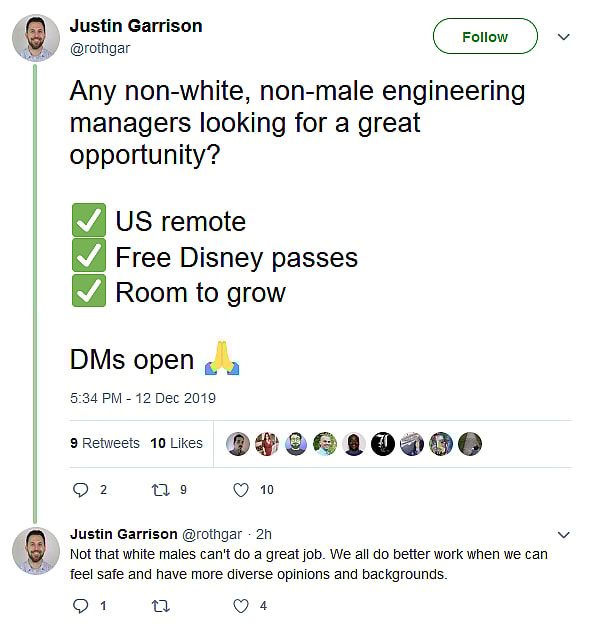 As first reported by Itchy Bacca of Disney Star Wars Is Dumb, now-former Disney Animation Studios employee Justin Garrison placed a since-deleted ad for a “non-white, non-male engineering manager” to his personal Twitter in December of 2019.