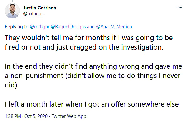 “[Disney] suspended me for 3 weeks,” recalled Garrison. “Had a 2+ month investigation, threatened me with legal action for various things, asked me about tweets from years ago, and my manager told me I should really question if I’m racist or not because what I did was racist and illegal.”