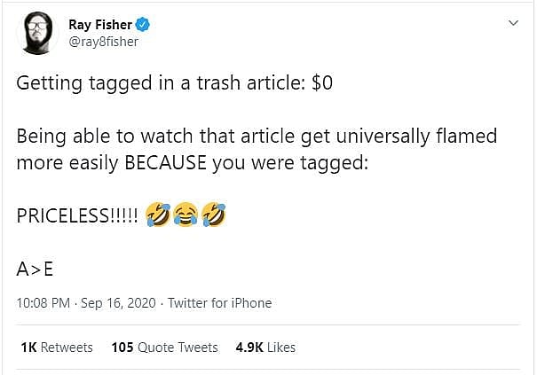 Fisher responded to TheWrap’s report on Twitter writing, “Getting tagged in a trash article: $0. Being able to watch that article get universally flamed more easily BECAUSE you were tagged: PRICELESS!!!!!”
