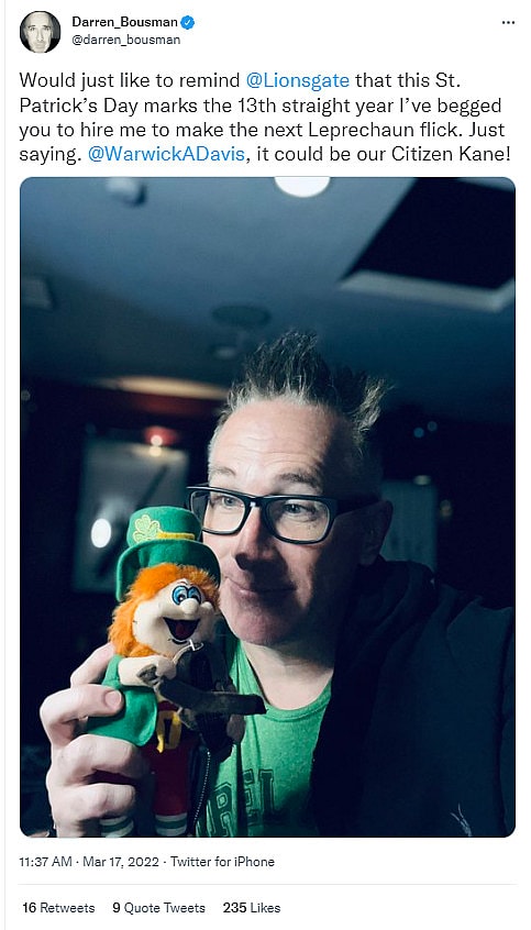 This past St. Patrick’s Day, Bousman also tweeted, “Would just like to remind Lionsgate that this St. Patrick’s Day marks the 13th straight year I’ve begged you to hire me to make the next Leprechaun flick. Just saying. Warwick Davis, it could be our Citizen Kane!”