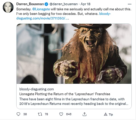 Reacting to the report that Lionsgate wants to develop another Leprechaun film, Bousman tweeted, “Someday. Lionsgate will take me seriously and actually call me about this. I’ve only been begging for two decades. But, whatevs.”