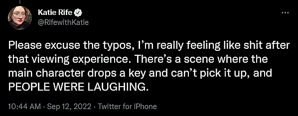 “Please excuse the typos, I’m really feeling like shit after that viewing experience,” she lamented. “There’s a scene where the main character drops a key and can’t pick it up, and PEOPLE WERE LAUGHING.”
