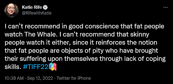 However, one critic who did not find herself pleased with her time with The Whale was Rife, who took to Twitter following her attendance of the film’s premiere to let her followers know that she could not “recommend in good conscience that fat people watch The Whale.”