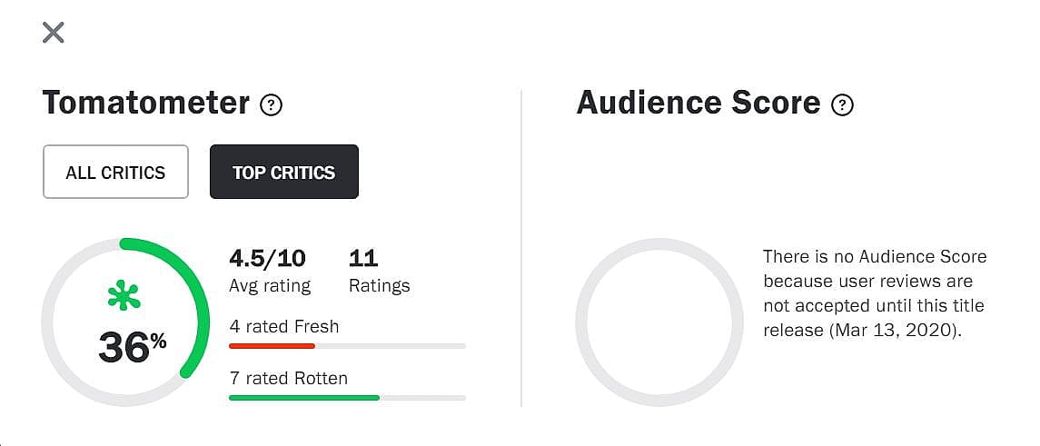 The film performs much worse when you just look at Top Critics. It has a 36% rotten rating from 11 reviews. The average rating from top critics is 4.5 out of 10. There are 4 fresh reviews and 7 rotten reviews.