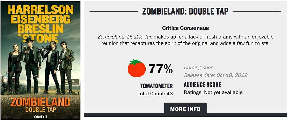 The Rotten Tomatoes and Metacritic critic scores for Zombieland: Double Tap have been released.