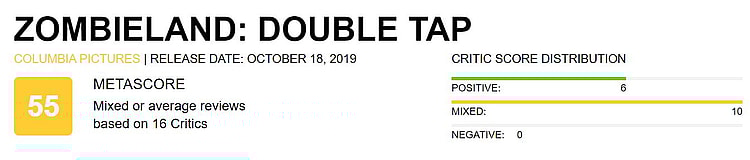 The Metacritic Metascore for Zombieland: Double Tap sits at 55 from 16 reviews.