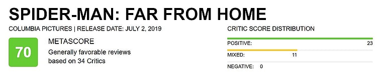 The Metacritic critic score, Metascore, is considerably lower than Rotten Tomatoes. The film currently has a 70 from 34 critics with 23 positive and 11 mixed. There are 0 negative reviews.