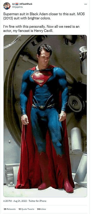 “Superman suit in Black Adam [is] closer to this suit. MOS (2013) with brighter colors,” wrote the Twitter user. “I’m fine with this personally, my fancast is Henry Cavill.”