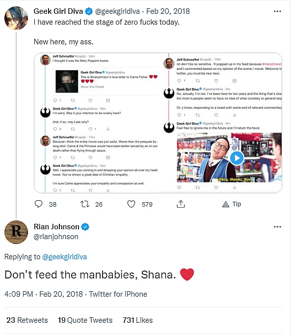 Rian Johnson infamously referred to critics of The Last Jedi as manbabies. When one Twitter user expressed his opinion that The Last Jedi was awful to Twitter user Geek Girl Diva, Johnson replied saying, “Don’t feed the manbabies, Shana.”