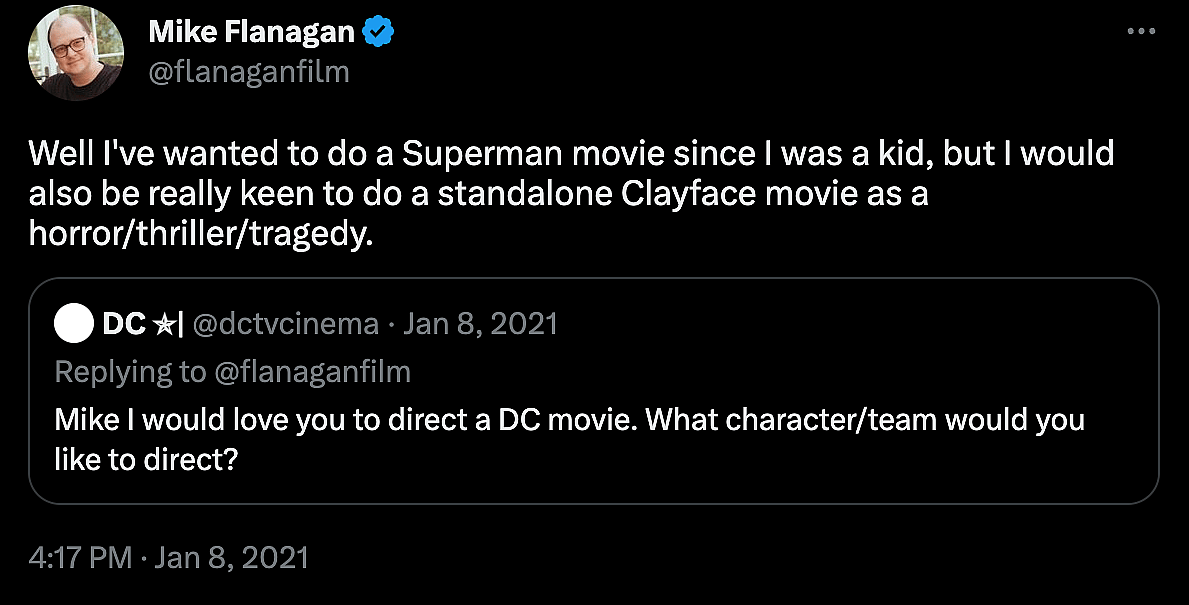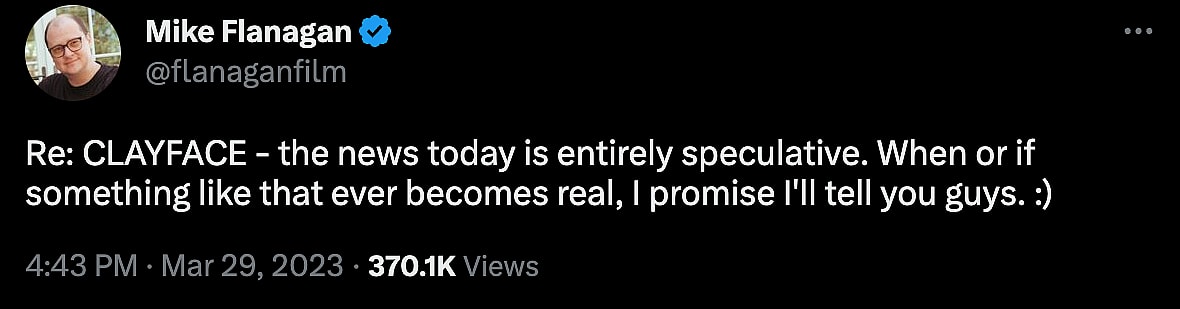 Despite the source and the potential here, Flanagan decided to throw everyone off his trail. In a slight denial of the rumor at hand, he tweeted in response, “Re: CLAYFACE – the news today is entirely speculative. When or if something like that ever becomes real, I promise I’ll tell you guys.” Social media will be excited when he does.