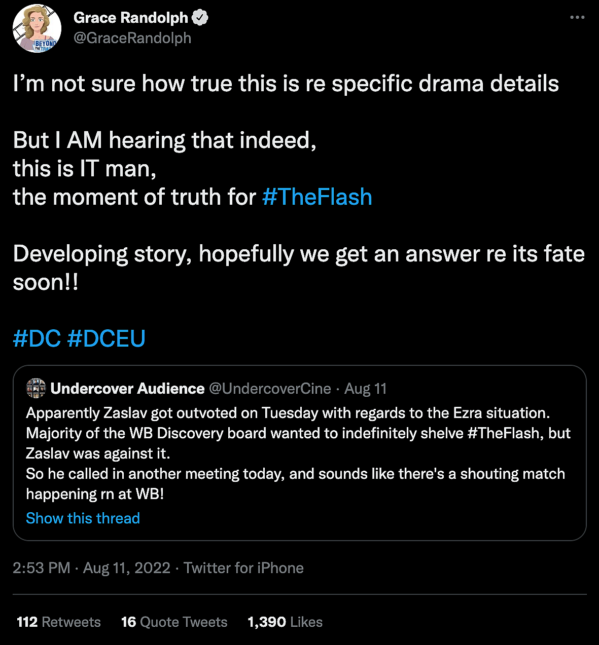 YouTuber and film scooper Grace Randolph backed up the claim, declaring, “I’m not sure how true this is re specific drama details. But I AM hearing that indeed, this is IT man, the moment of truth for #TheFlash Developing story, hopefully we get an answer re its fate soon!!