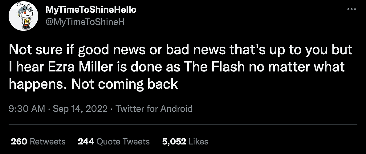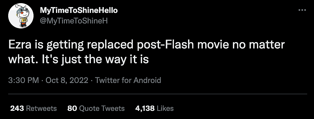 The account’s latest tweet on the matter claims, “Ezra is getting replaced post-Flash movie no matter what. It’s just the way it is.”
