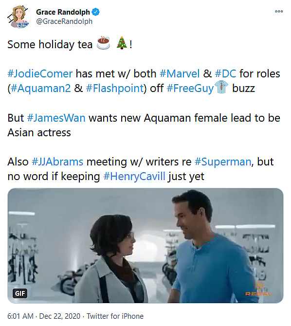 On Tuesday, Beyond the Trailer’s Grace Randolph dropped “some holiday tea”, breaking the news that “#JJAbrams meeting w/ writers re #Superman, but no word if keeping #HenryCavill just yet”.