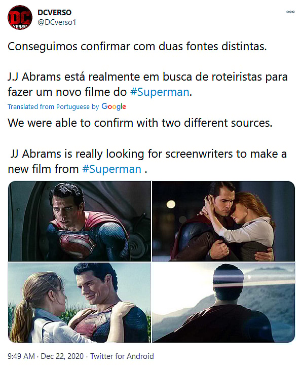 “We were able to confirm with two different sources,” says DCVERSO’s tweet when translated. “JJ Abrams is really looking for screenwriters to make a new film from #Superman.”