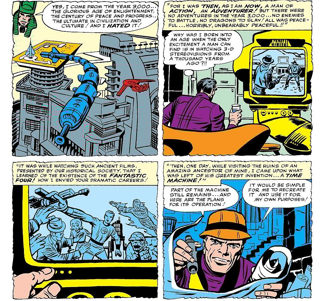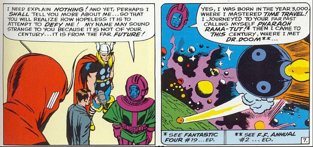 This reveal in Avengers #8 references the events of Fantastic Four #19, where Pharaoh Rama-Tut reveals to the Fantastic Four that he is a time traveler from the year 3,000. Not only does it reveal him to be a time traveler from the year 3,000, but that he is a white man.