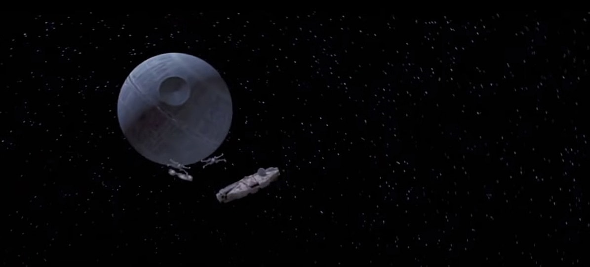 The scrawl concludes, “Under the command of a mighty Jedi warrior known as THE STARKILLER, the REBEL ALLIANCE has won a crushing victory over the deadly Imperial Star Fleet. The Empire knows that one more such defeat will bring a thousand more solar systems into the rebellion, and Imperial control of the Outlands could be lost forever…”