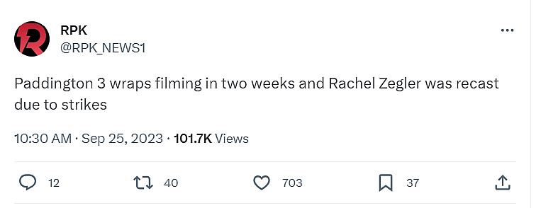 This new rumor comes from scooper Daniel RPK who writes on X, “Paddington 3 wraps filming in two weeks and Rachel Zegler was recast due to strikes.”