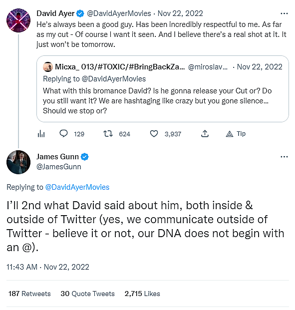 A substantial hint there’s some accuracy to the rumor is what Ayer tweeted in late November about it all. “[Gunn] He’s always been a good guy. Has been incredibly respectful to me. As far as my cut – Of course I want it seen. And I believe there’s a real shot at it. It just won’t be tomorrow,” Ayer said.