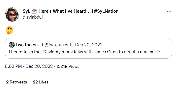 But again, for the above to materialize, Ayer has to get his foot back in the door on the Warner lot first. This is where the rumor from TwoFace – TF that Ayer will direct a DCU movie comes in as, according to Abdul, Gunn wants to assemble action-oriented talent to help him relaunch the universe, and other than Ayer, James Mangold’s name came up.