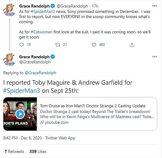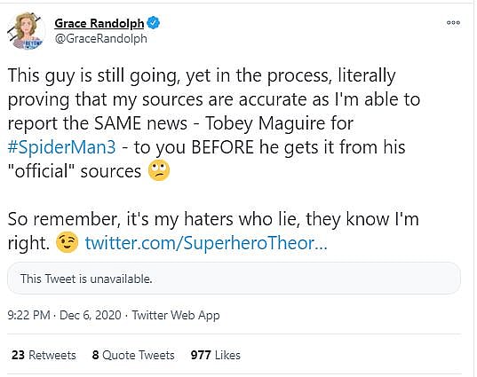 After being accused by a critic of falsifying her claim that the web-slinging crossover would be revealed at Comic Con Experience Sao Paulo, Randolph explained that the event simply had “NO REVEALS” on the event’s final day, and reiterated that she was able to report “Tobey Maguire for #SpiderMan3.”