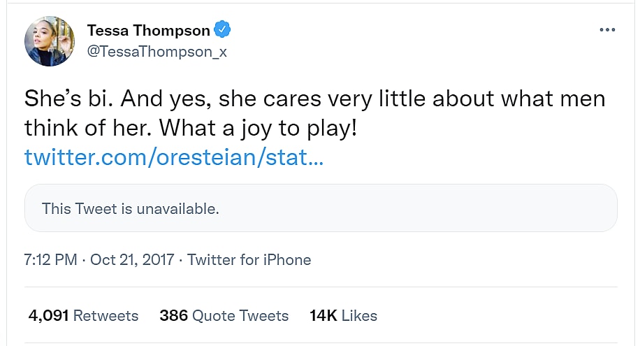 Thompson claimed her character was bi back in October 2017, “She’s bi. And yes, she cares very little about what men think of her. What a joy to play!”