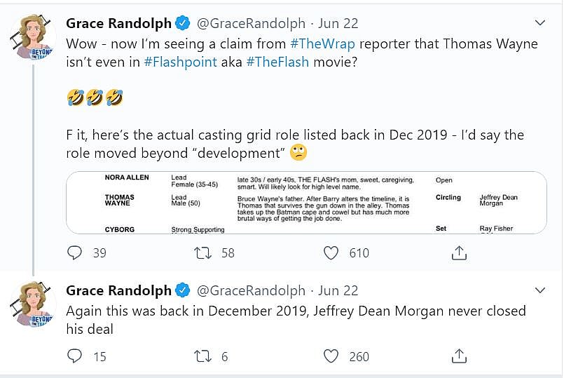 Before Keaton’s name came up again, fingers were crossed Jeffrey Dean Morgan would return as Thomas Wayne to become Flashpoint Batman. Stories emerged he was in serious discussions with Warner Bros. but Grace Randolph put those to bed.