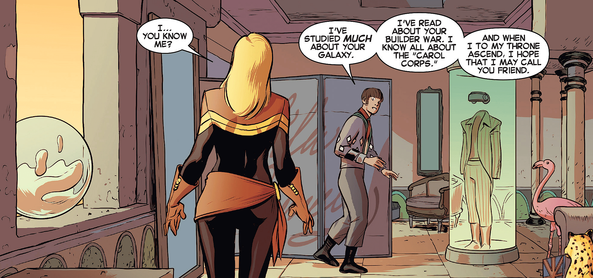 But upon speaking with Yan herself, Carol soon discovers that not only is he being forced to hold Lila to her childhood promise by his parents in order to fulfill their desire for an alliance with the Avengers, but that the Earthling the Prince actually has eyes for is her.